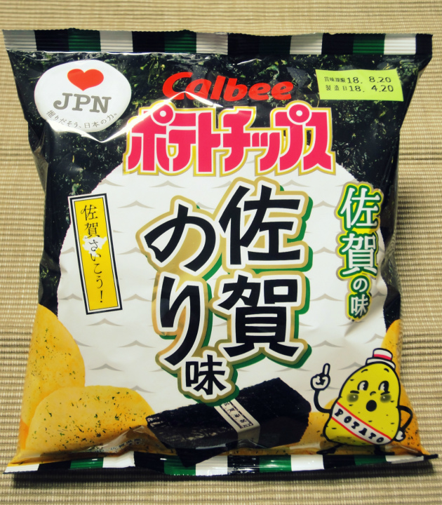 2018-05-14 カルビー ポテトチップス 佐賀のり味 スナック NEW! カルビーの新作「ポテトチップス 佐賀のり味」を食してみた。「♥ JPN」プロジェクト第一弾“17道府県の味”から選出された5つのフレーバーが全国発売。佐賀の味は佐賀のり。私の低スペな舌が海苔の違いを判別できるとは思えないのだが、普通ののり塩とは一味違う独特の風味が感じられた。これが佐賀のりならではの味わいなのかしら。或いはただの思い過ごしかも知れない。 ※一袋55グラム